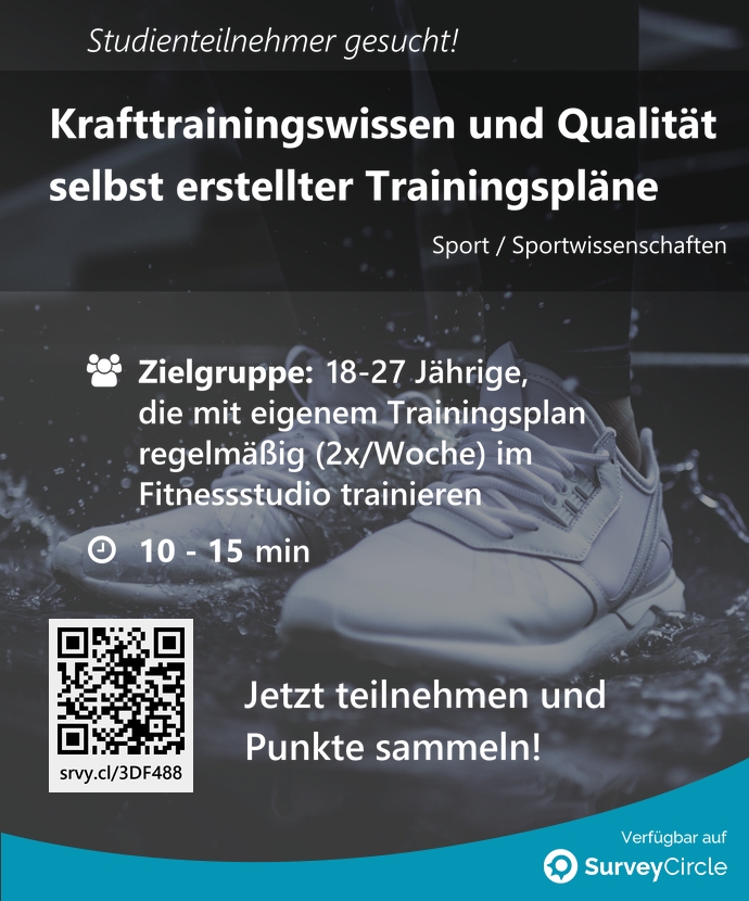 ich suche dringend noch einige Teilnehmende für meine Masterarbeit. Ich untersuche den Zusammenhang zwischen krafttrainingsspezifischen Wissen und der Qualität selbst erstellter Trainingspläne von jungen Erwachsenen im Fitnessstudio.