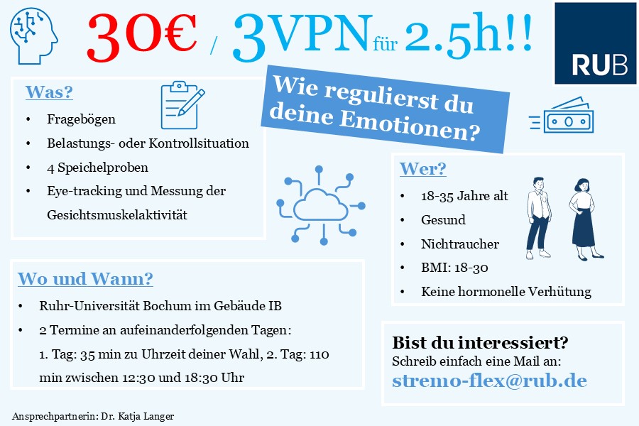 Du möchtest dir in den Semesterferien 30€ dazuverdienen und hast Zeit für eine kurze Studienteilnahme (2.5h)? Dann bist du hier genau richtig! Nimm dazu lediglich an unserer Studie zur Emotionsregulation teil.